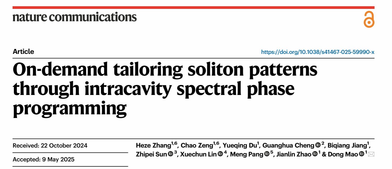 程光华教授以及芬兰阿尔托大学孙志培教授合作,利用光谱相位调控技术在光纤激光器中首次产生了具有可控间距的超短脉冲串,攻克了锁模脉冲时域位置难以主动控制的科学难题。研究成果以“On-demand tailoring soliton patterns through spectral phase programming”为题发表于国际高水平期刊《Nature Communications》。在读博士研究生张何泽和曾超副教授为论文的共同第一作者,毛东教授为通讯作者。论文链接://www.nature.com/articles/s41467-025-59990-x